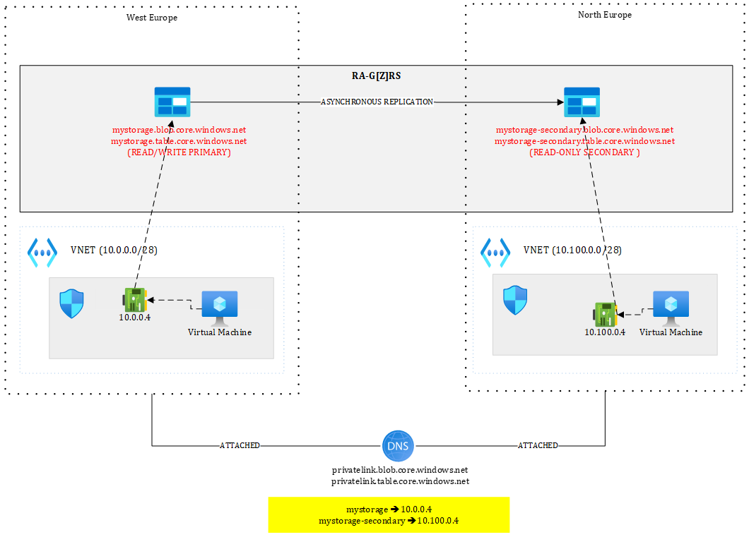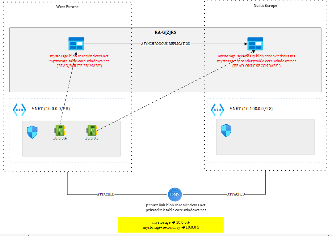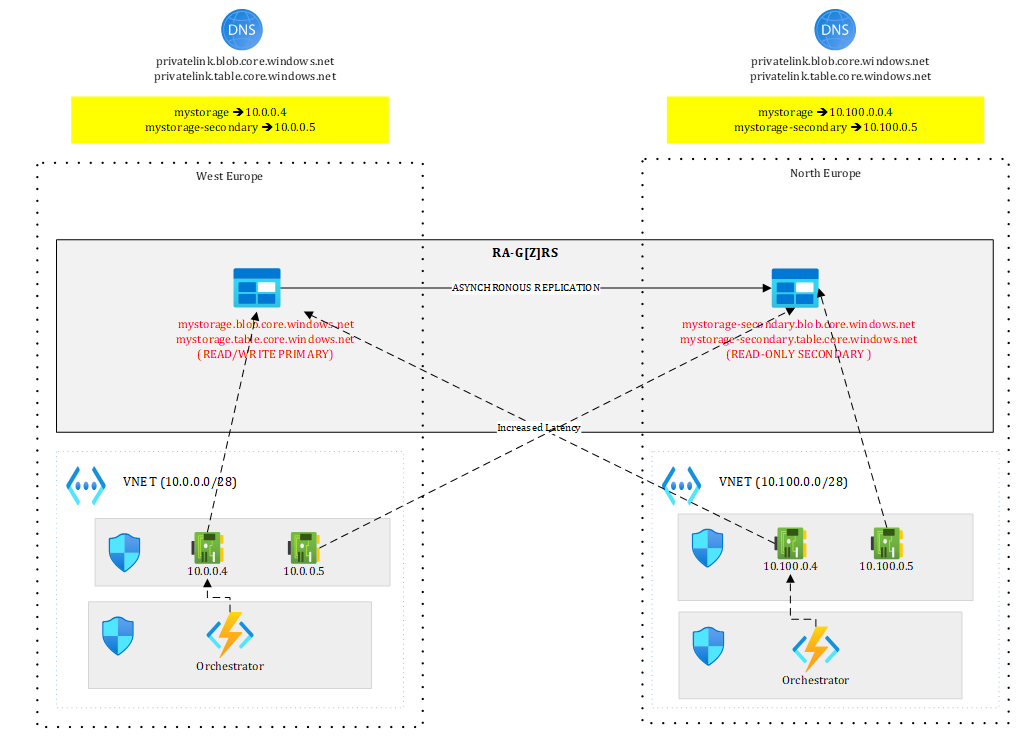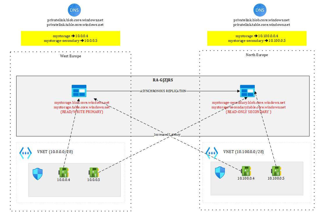 Each region has its own private DNS zone and each holds a set of private endpoints targeting both primary and secondary. Now, both mystorage and mystorage-secondary are resolved and routable from both sides. From North Europe, a call to mystorage would go through 10.100.0.4 and hit the West Europe location.