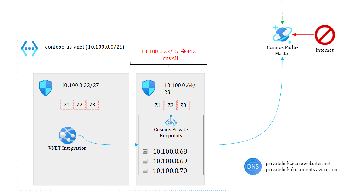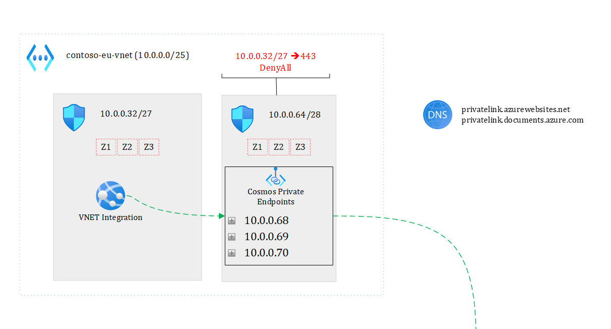My US and EU app services talk respectively to their regional Cosmos DB endpoint under normal circumstances. Note that each region has three private endpoints (one for each region plus the non-regional endpoint), which makes it possible from EU to go to the US and vice versa through the private endpoint plumbing. If, for some reason, the EU backend cannot talk to the EU Cosmos endpoint, it will take the US path. Of course, there is an impact on latency but the solution keeps working and the application doesn’t even need to be restarted. In case of a full regional outage (say entire EU is down), Front Door would direct all API calls to the US backend.