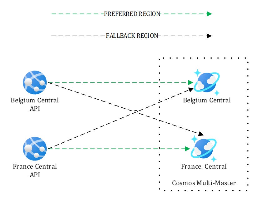 Each of the backends hosted on app services is leveraging the Cosmos DB SDK, which is smart enough to detect whether the corresponding Cosmos DB region is available or not. The API will seamlessly switch to the available region in case of a regional failure impacting only Cosmos DB. That’s what I’m going to focus on in this article.