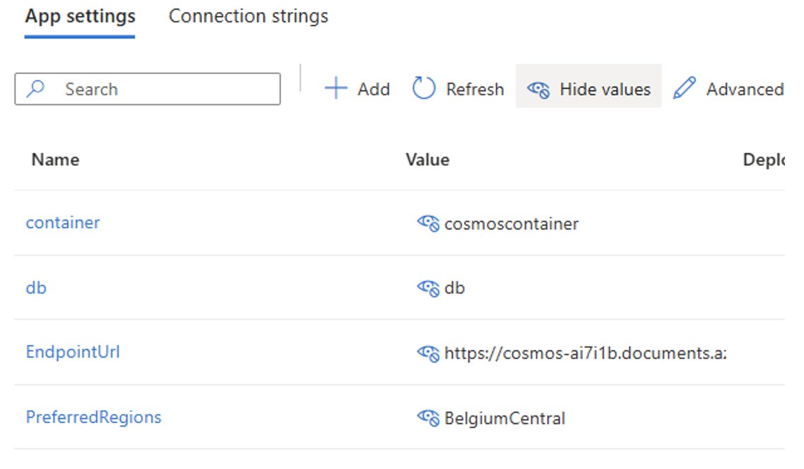 I made sure the webapp’s managed identities are granted access to Cosmos and I pre-deployed a database and a container.