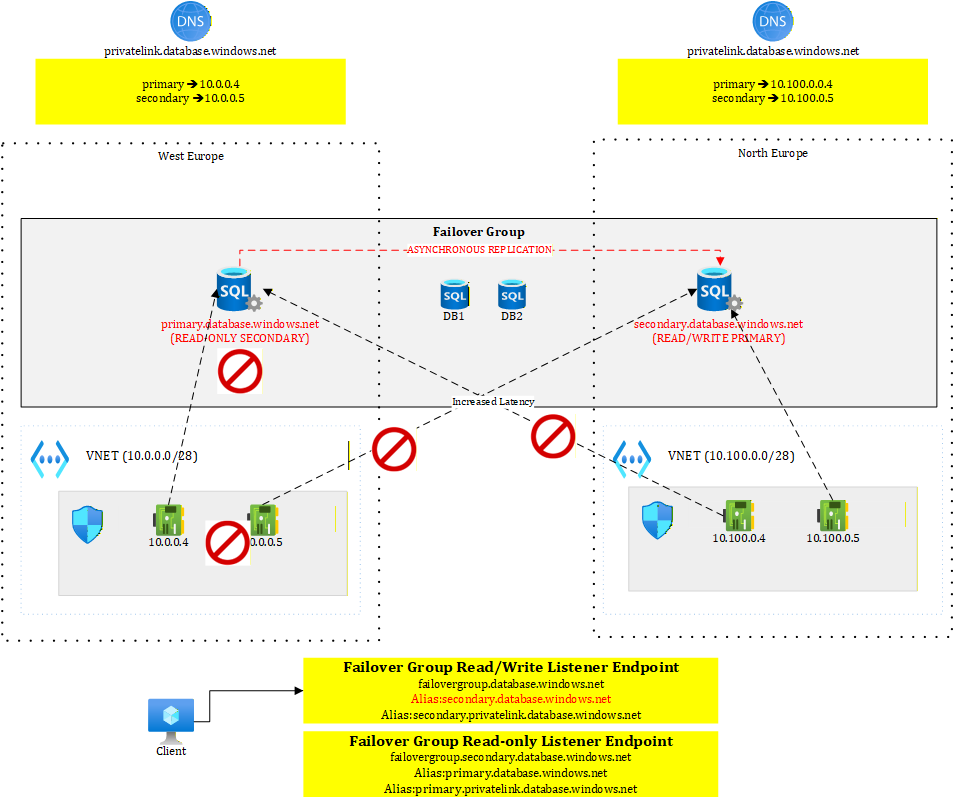 The primary (West Europe) is gone. Perhaps the entire region is gone, meaning that 10.0.0.4 is lost, so even though you would have routed traffic initially from North Europe to West Europe, it’d stop working.