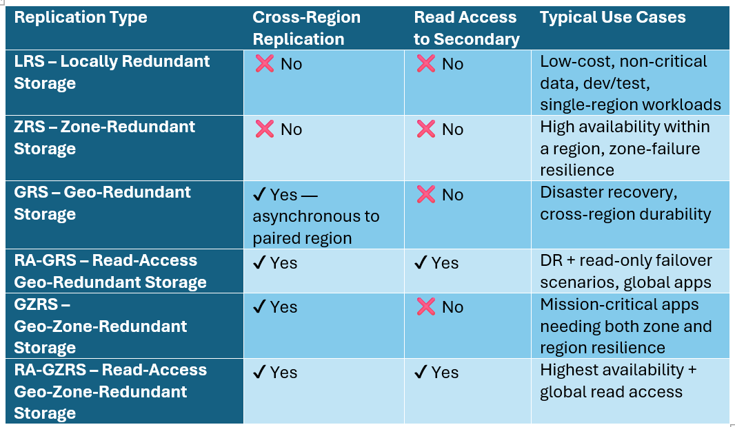 All the above options are only available in paired regions. Additionally, blobs can also be replicated using the object replication feature, but this is by no means comparable to the above options.