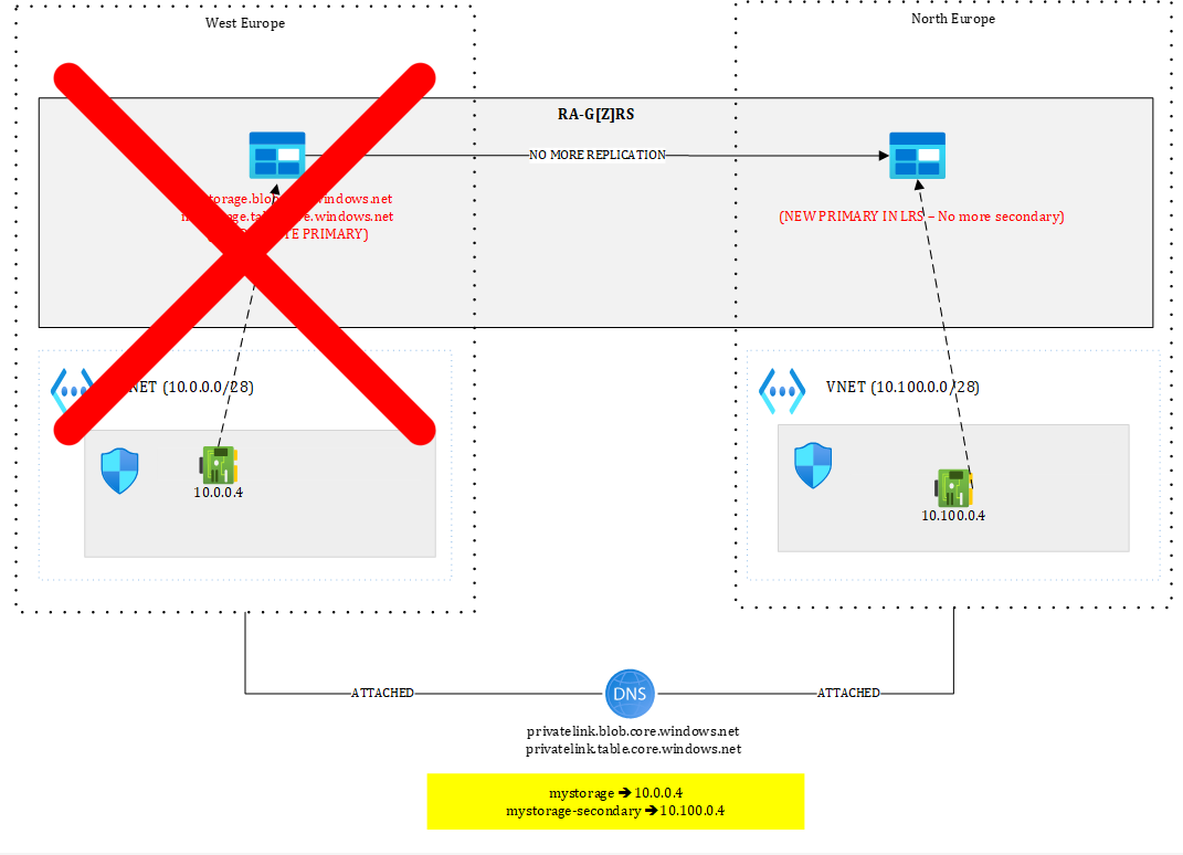 You’d be left with 10.100.0.4 still targeting the secondary but after failover, there is no more secondary...The failover process converts the Storage Account into a Locally Redundant Storage (LRS), so the notions of primary and secondary do not exist anymore. The North Europe has just become the new primary, making 10.100.0.4 now pointing to an unreachable target.
