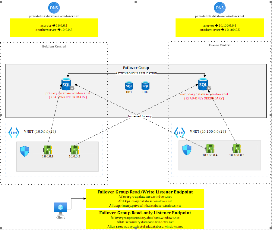 Active geo-replication may require updates to connection strings or DNS records to point to the new primary after a failover. That said, the actual impact depends on where (*) the client application is located as well as how you deploy to both regions. Let’s look at this in more detail. Figure 1 illustrates an active geo-replication setup between Belgium Central and France Central.