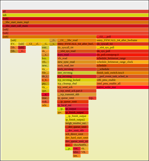 A fantastic thing about the FG is that both userspace and kernel-space functions are captured! It’s thus called a mixed-mode FG. For e.g., with the ‘ssh’ FG, you can clearly see the call path leading down to the kernel network protocol stack code – functions from the socket/INET layer sock_*(), followed by L4 tcp_*(), followed by the L3 ip_*() functions; even the invocation of the (network) device transmit – the dev_hard_start_xmit() and others – are visible!