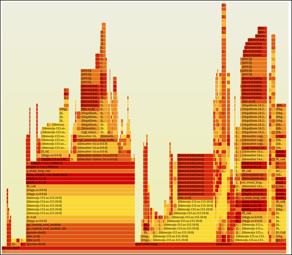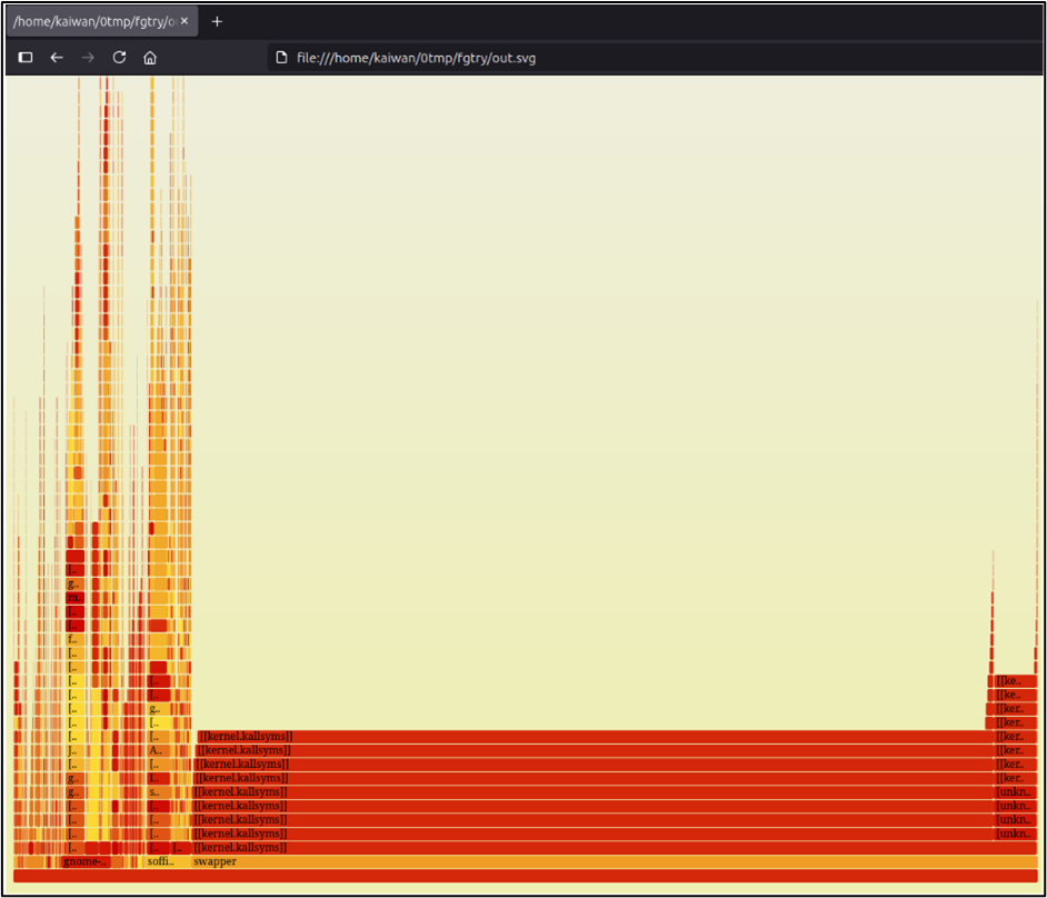 sudo perf record -F 99 -a --call-graph dwarf -- sleep 10sudo chown ${LOGNAME}:${LOGNAME} perf.dataperf script > perfscript_out.datcat perfscript_out.dat | ~/FlameGraph/stackcollapse-perf.pl |~/FlameGraph/flamegraph.pl > out.svgOpen the SVG file in a web browser. Here’s a screenshot of the Flame Graph