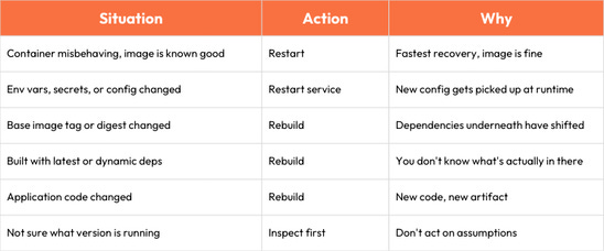 Config, env vars, or secrets changed? Restart the service. New values get picked up at runtime. No need for a new image.